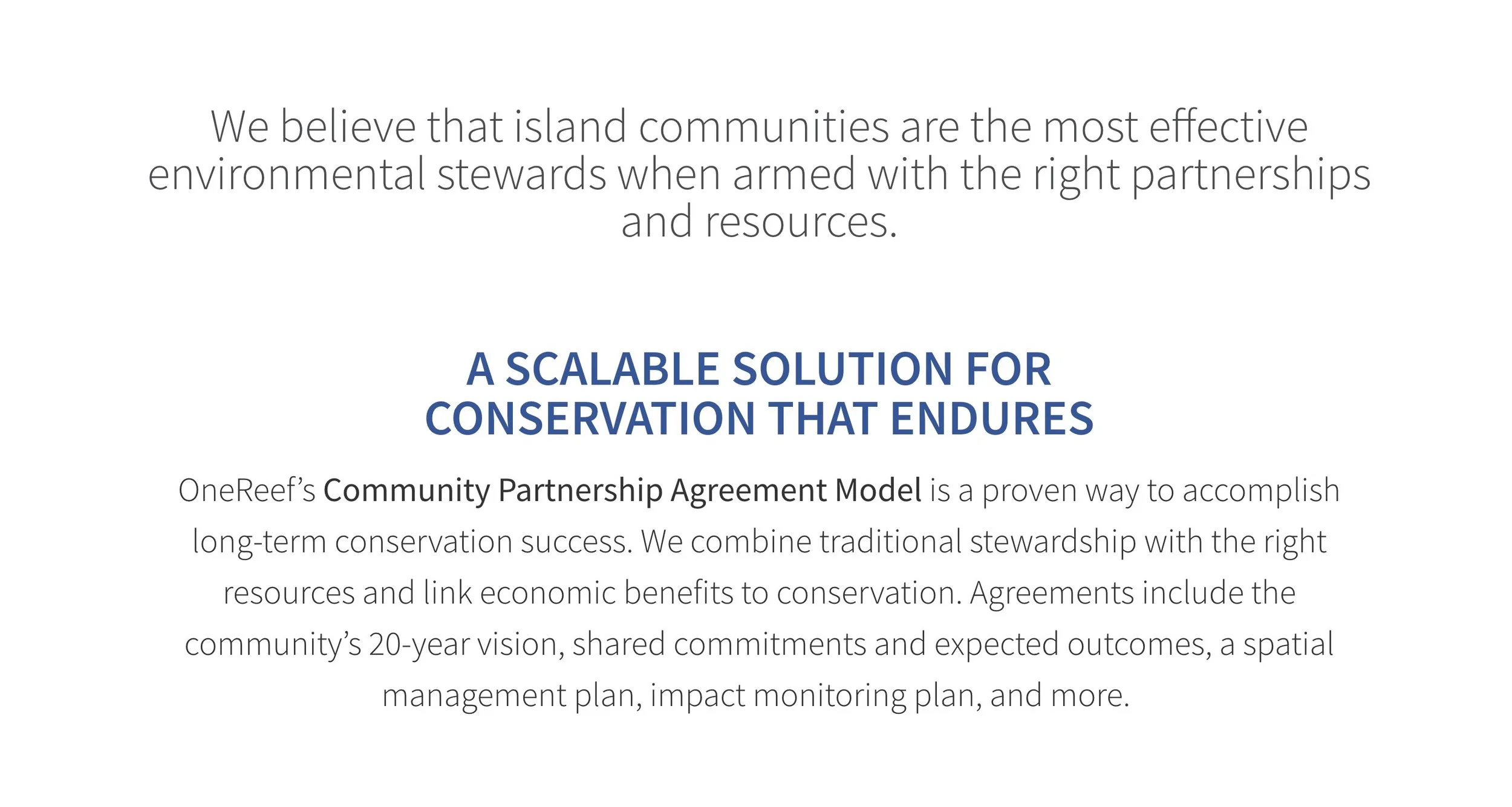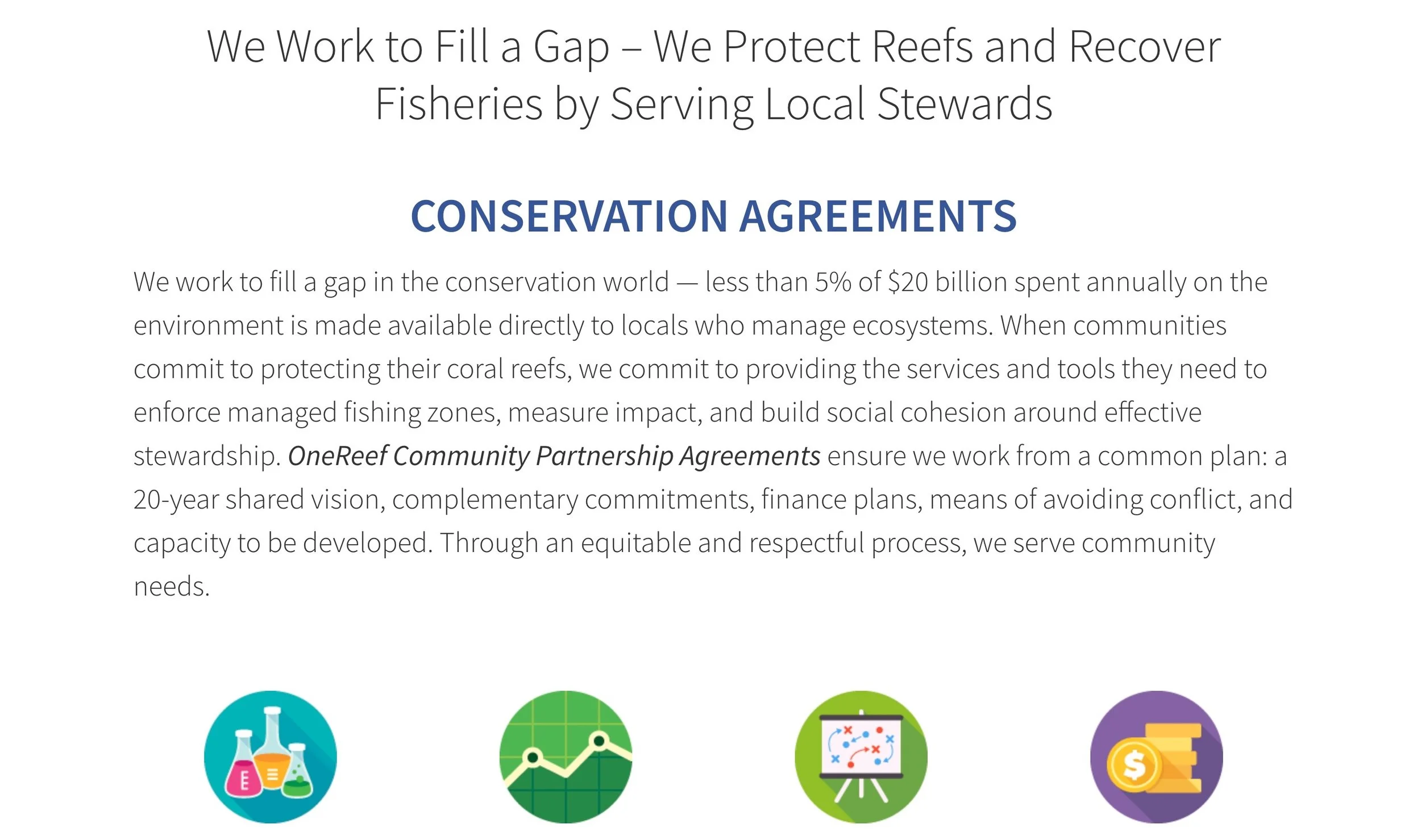Examples of partnerships and resources include: developing and supporting community marine management plans, mentoring to build local capacity for effective coral reef management, establishing sustainable financing plans Training and infrastructure to protect reefs, and science-based monitoring to measure impact.